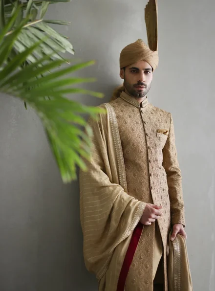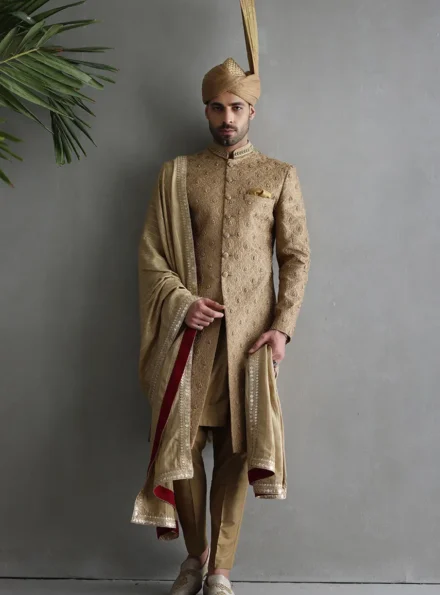 The Majestic Gold Embroidered Sherwani | Luxury Groom Wear
