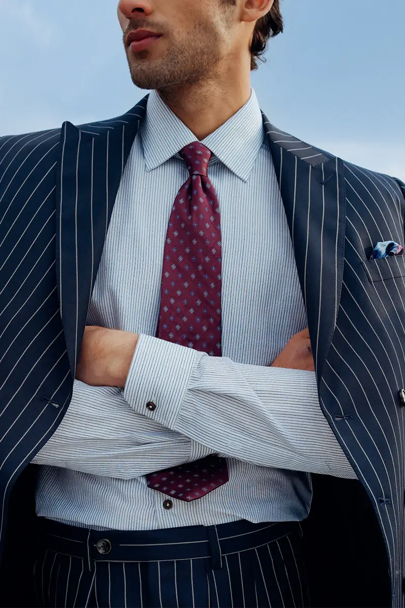 • Style: Assertive double-breasted jacket with wide peak lapels.