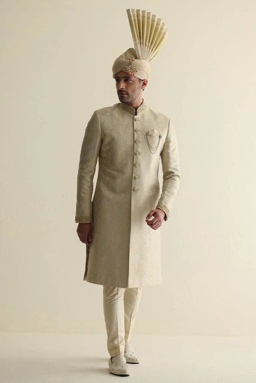 The luxurious jamawar fabric, known for its rich texture and delicate patterns, gives this sherwani a majestic feel. Perfect for a groom or a wedding guest, this off-white sherwani provides a look that is both traditional and effortlessly modern.