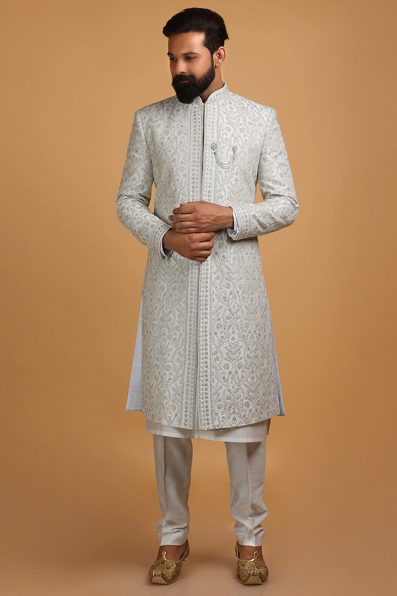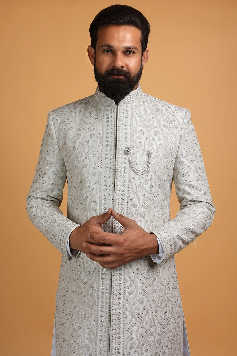 This elegant, heavily embroidered sherwani for men by Gents Suiting by Fab is the ideal choice for grooms and wedding guests. A sophisticated sherwani for wedding that promises a regal look, making it the perfect dulha sherwani or special occasion sherwani suit.