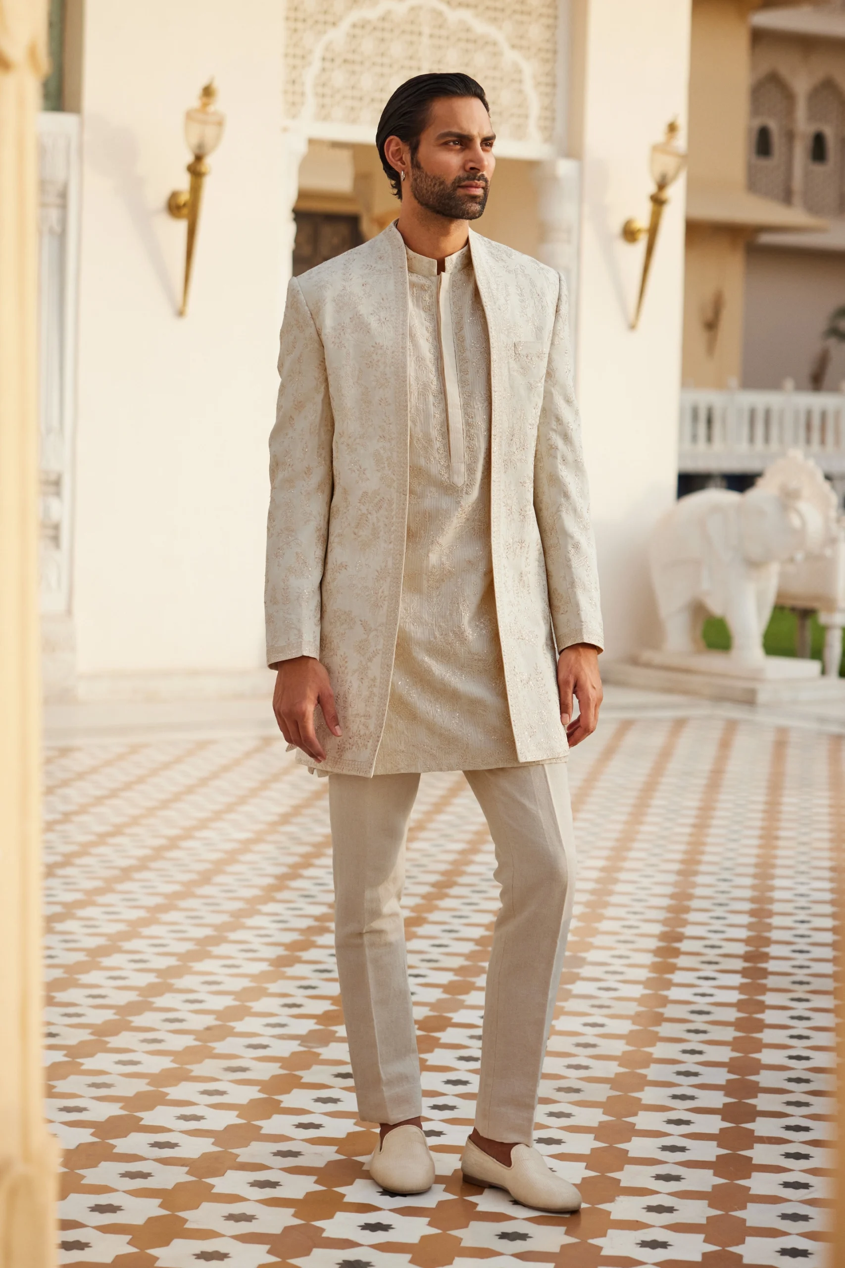 This Sherwani by Gents Suiting by Fab is an opulent embroidered sherwani ideal for the modern groom. This premium silk sherwani for men features intricate embroidery, perfect as a majestic dulha sherwani or a sophisticated sherwani for wedding. It’s an elevated choice over a standard sherwani suit, offering a truly memorable look.