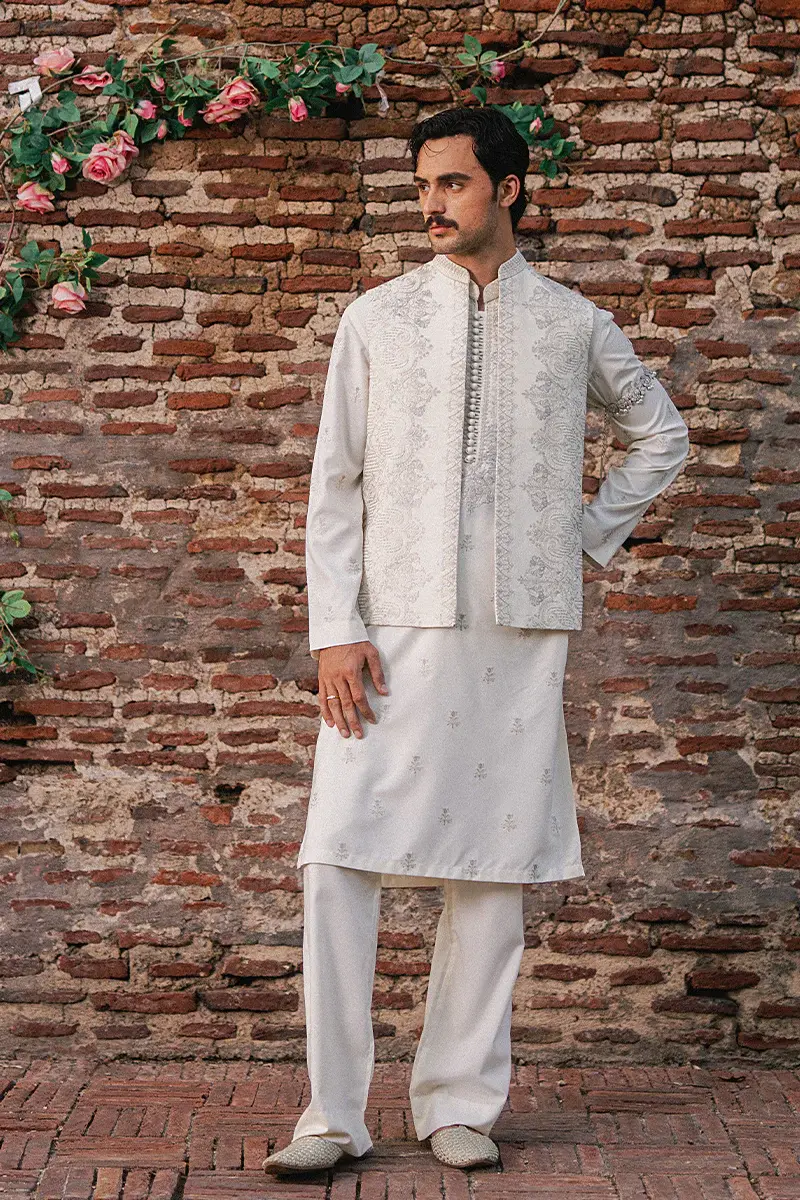 Step into any formal event with unmatched elegance with the Embroidered Open Waistcoat from Gents Suiting by Fab. This exquisite piece is a must-have addition to your traditional wardrobe, designed for the man who appreciates subtle luxury and impeccable craftsmanship.