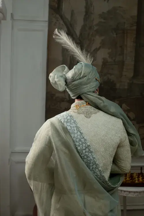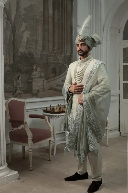 The Epitome Sage Brocade Sherwani For Royal Wedding Attire