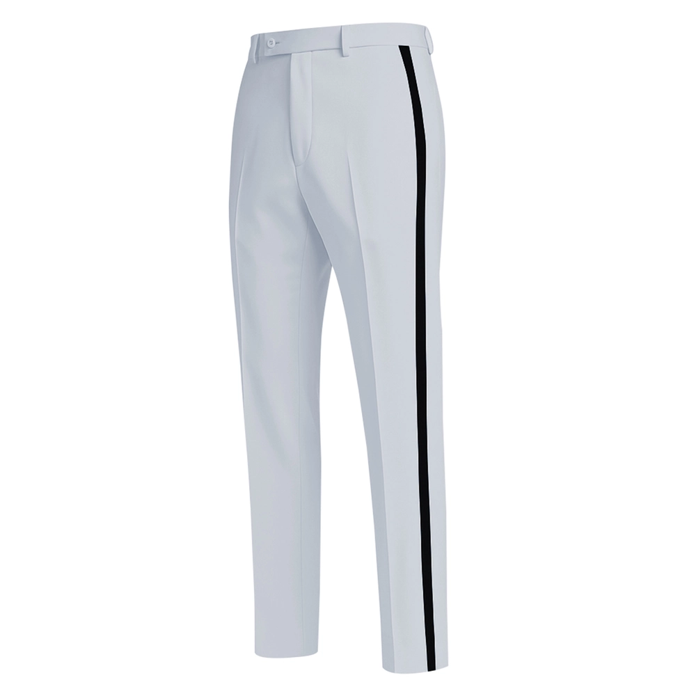 • Trousers: White flat-front trousers featuring the signature black strip down the side, essential for any true Tuxedo. The Slim Fit Suit cut ensures a modern, sharp silhouette.