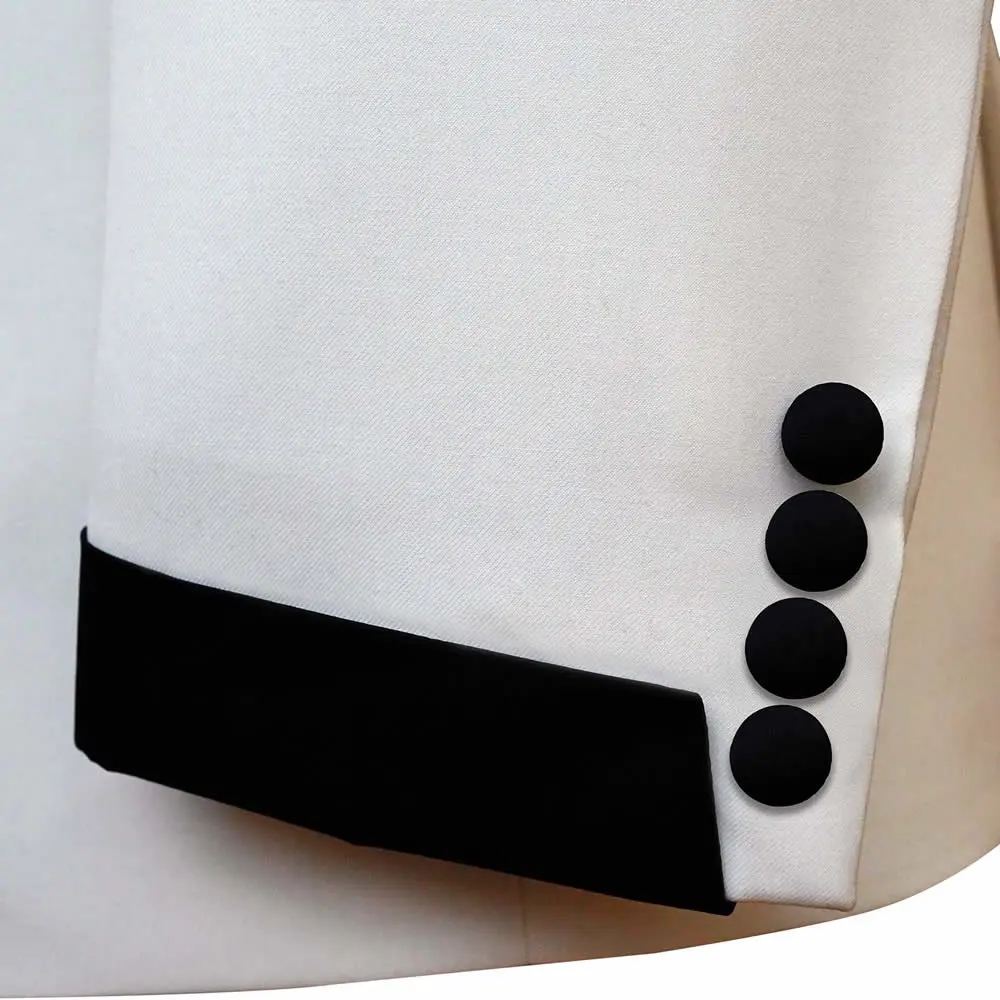 • Jacket: Crisp white jacket featuring a bold black contrasting shawl lapel. The sleeve cuffs and button detailing (as seen in the uploaded images) incorporate a tasteful black accent, emphasizing the Designer Suit aesthetic. The interior boasts quality black and white lining, a hallmark of Premium Suiting.